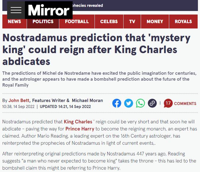 Όπως αναφέρει η mirror.co.uk, ο συγγραφέας Mario Reading, κορυφαίος ειδικός στον αστρολόγο του 16ου αιώνα, στο νέο βιβλίο που έγραψε, υποστήριξε ότι με βάση μια παλιά «προφητεία» ο Κάρολος θα βασιλέψει λίγο και θα αναγκαστεί να παραιτηθεί και θα ορίσει έναν απρόσμενο διάδοχο.