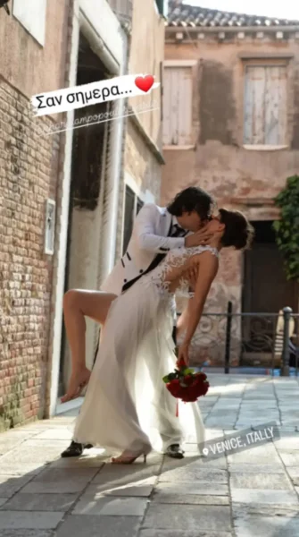 Μία παρόμοια φωτογραφία ανέβασε και η Λίνα Πρίντζου. Ωστόσο, στο δικό της στιγμιότυπο, το ζευγάρι ανταλλάσσει ένα τρυφερό φιλί.