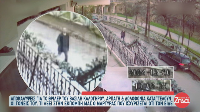 Στο μεταξύ, φωτογραφίες του Βασίλη Καλογήρου από κάμερες ασφαλείας και δορυφόρο έχουν δει το φως της δημοσιότητας. Οι φωτογραφίες δείχνουν τον 39χρονο να περπατάει στη Λάρισα λίγες ώρες πριν την εξαφάνισή του. Επίσης, δορυφόρος κατέγραψε κίνηση οχήματος και ανθρώπων στην περιοχή όπου βρέθηκε νεκρός ο Καλογήρου, στις 11 Φεβρουαρίου.