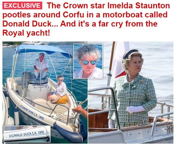 Θα μπορούσε κανείς να το χαρακτηρίσει και… υποβάθμιση από τα προηγούμενα πλοία στα οποία βρέθηκε τον τελευταίο καιρό, αλλά η σταρ του The Crown, Ιμέλντα Στόντον, φαινόταν ικανοποιημένη να αντάλλαξε το Royal Yacht Britannia με ένα μικροσκοπικό μηχανοκίνητο σκάφος που ονομάζεται Donald Duck στην Κέρκυρα!