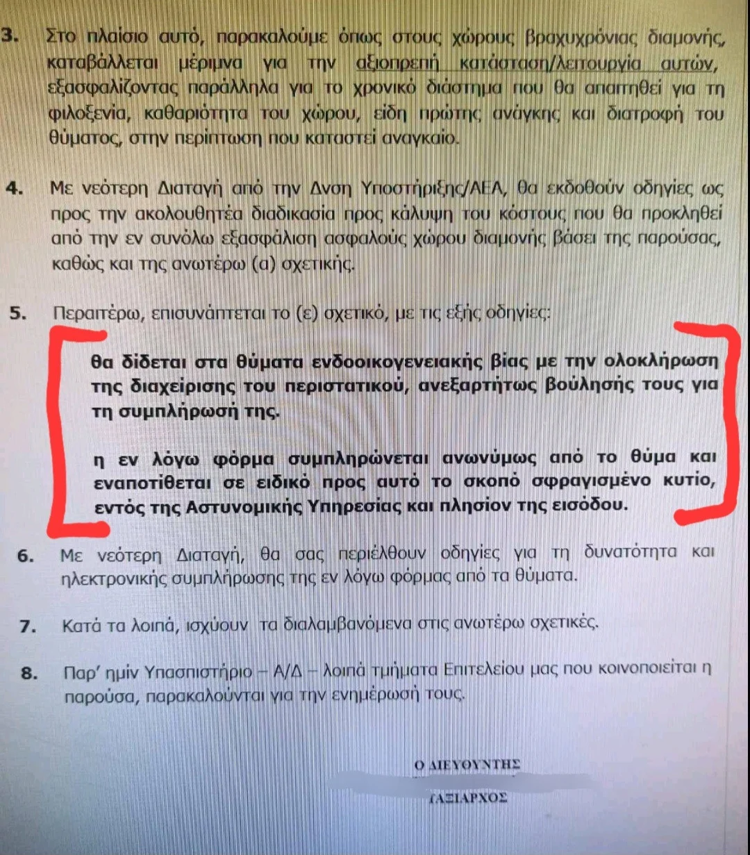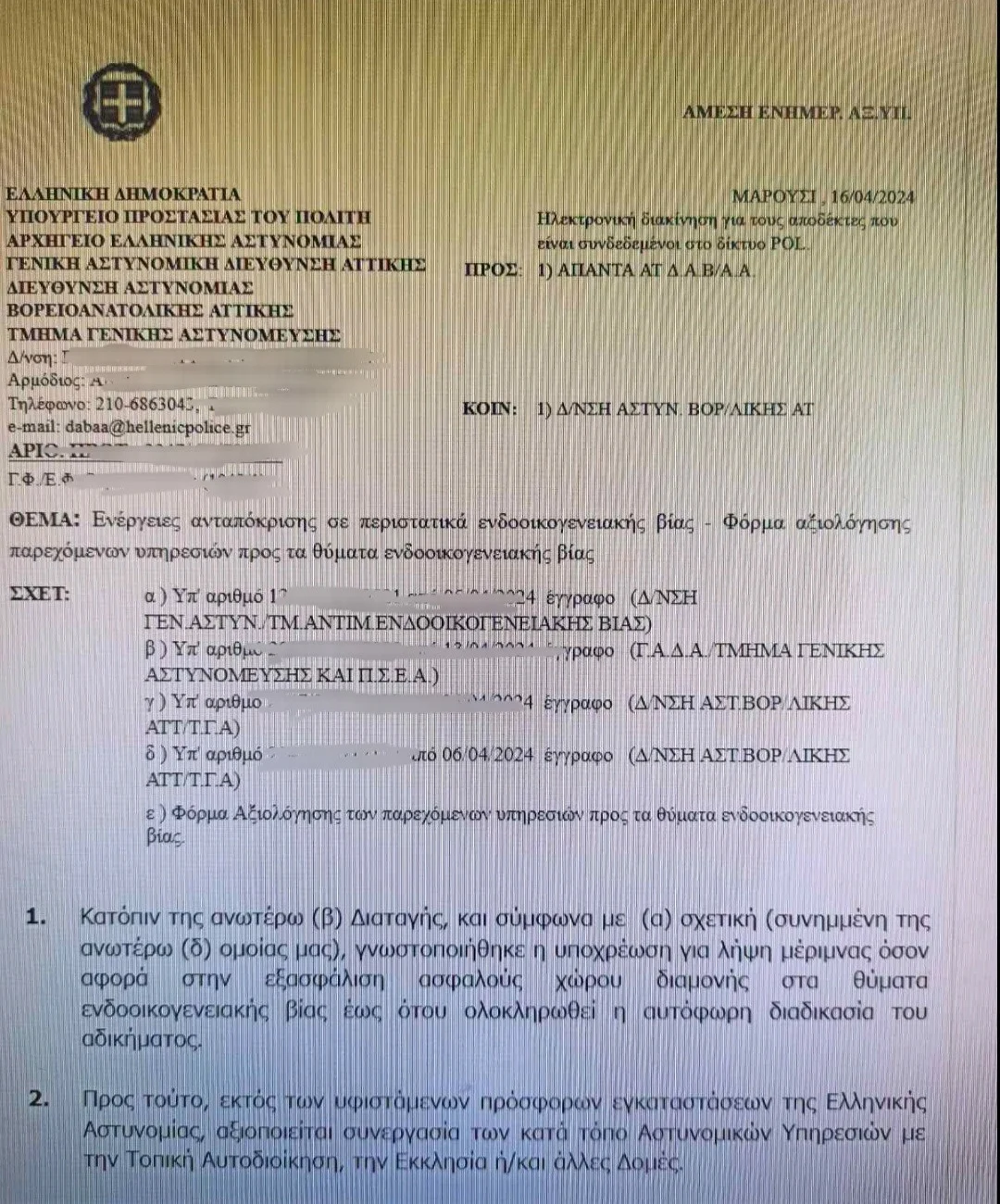 «Έντονο προβληματισμό, αγανάκτηση και πολλά ερωτηματικά, ως προς τα πραγματικά της κίνητρα, προκαλεί η πρόσφατη διαταγή του Αρχηγείου της Ελληνικής Αστυνομίας με αντικείμενο τη δυνατότητα αξιολόγησης … από τα ίδια τα θύματα (!), των αστυνομικών που χειρίζονται υποθέσεις ενδοοικογενειακής βίας!