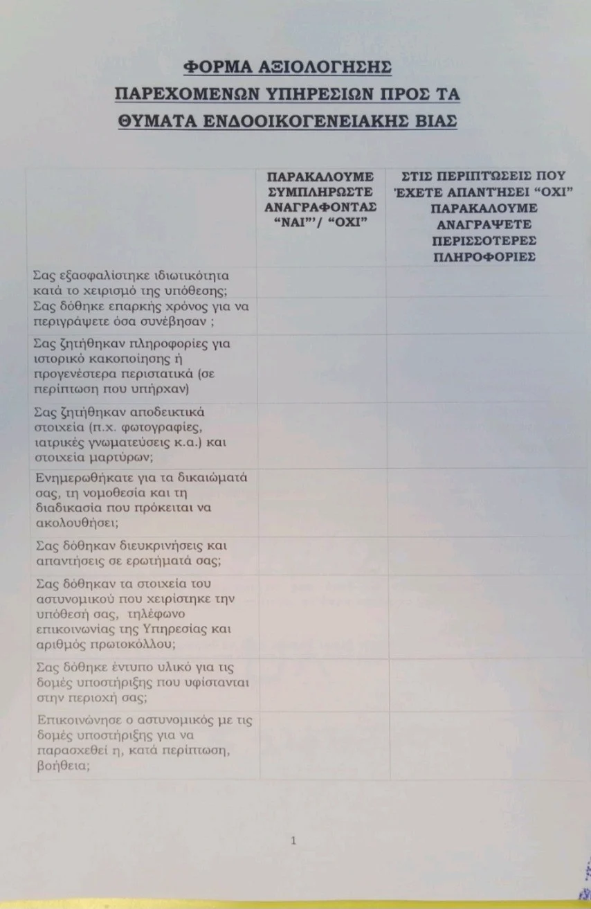 Σύμφωνα με τη διαταγή της ΕΛ.ΑΣ., «θα δίνεται φόρμα αξιολόγησης στα θύματα ενδοοικογενειακής βίας με την ολοκλήρωση της διαχείρισης του περιστατικού, ανεξαρτήτως βούλησής τους για τη συμπλήρωσή της. Η εν λόγω φόρμα συμπληρώνεται ανωνύμως από το θύμα και εναποτίθεται σε ειδικό προς αυτό το σκοπό σφραγισμένο κυτίο, εντός της αστυνομικής υπηρεσίας και πλησίον της εισόδου». Σε δεύτερο χρόνο αναμένεται να δημιουργηθεί και ηλεκτρονική φόρμα υποβολής.