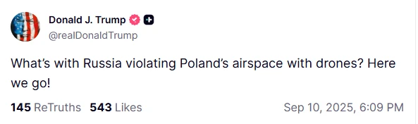 Με μια σύντομη, αλλά γεμάτη νόημα, δήλωση, ο Τραμπ έγραψε… «Γιατί η Ρωσία παραβιάζει τον εναέριο χώρο της Πολωνίας με drones; Ξεκινάμε!». Η φράση «Ξεκινάμε!» έχει προκαλέσει ερωτηματικά, καθώς δεν είναι σαφές τι ακριβώς εννοεί ο πρώην πρόεδρος. Μπορεί να αναφέρεται σε μια πιθανή κλιμάκωση των εντάσεων, σε μια αντίδραση των ΗΠΑ ή σε κάτι εντελώς διαφορετικό.