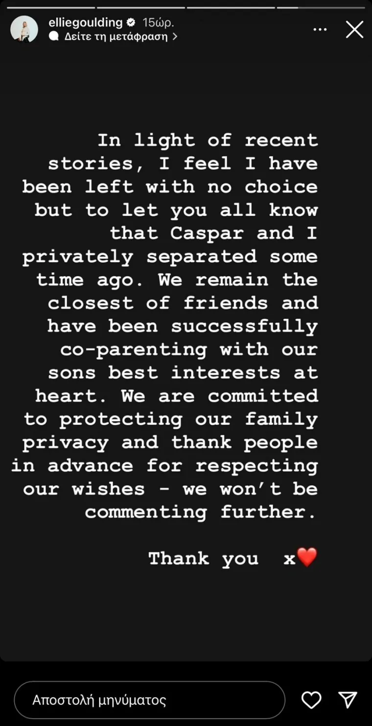 «Υπό το φως των πρόσφατων ιστοριών, αισθάνομαι ότι δεν μου έχει μείνει άλλη επιλογή από το να σας ενημερώσω όλους ότι ο Κάσπαρ και εγώ χωρίσαμε ιδιωτικά πριν από λίγο καιρό. Παραμένουμε οι πιο στενοί φίλοι και έχουμε συνκηδεμόνες με επιτυχία με γνώμονα το συμφέρον του γιου μας. Δεσμευόμαστε να προστατεύουμε την ιδιωτική ζωή της οικογένειάς μας και ευχαριστούμε εκ των προτέρων τους ανθρώπους που σέβονται τις επιθυμίες μας – δεν θα σχολιάσουμε περαιτέρω. Σας ευχαριστούμε», έγραψε χαρακτηριστικά η Έλι Γκούλντινγκ.