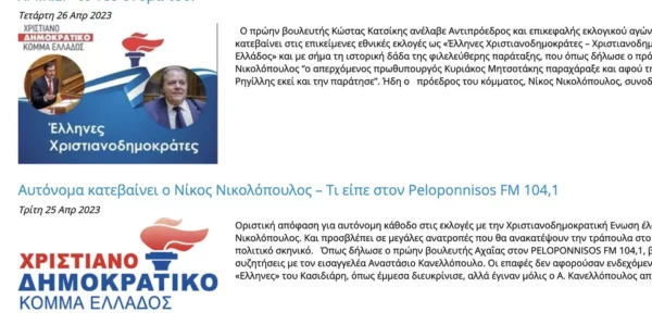 Ανάμεσα στα 50 κόμματα που έχουν καταθέσει αίτηση στον Άρειο Πάγο για συμμετοχή στις εκλογές της 21ης Μαΐου 2023… Βρίσκεται και το κόμμα του Νίκου Νικολόπουλου με την ονομασία «Ελληνες Χριστιανοδημοκράτες – Χριστιανοδημοκρατικό κόμμα Ελλάδος». Υπενθυμίζεται ότι έως τώρα το κόμμα Νικολόπουλου ονομαζόταν «Χριστιανοδημοκρατικό Κόμμα Ελλάδος». Έχει προστεθεί, δηλαδή, η ονομασία ΕΛΛΗΝΕΣ. Η οποία παραπέμπει στην ονομασία του κόμματος Κασιδιάρη. Έχει προστεθεί μάλιστα στο έμβλημα και η ελληνική σημαία.