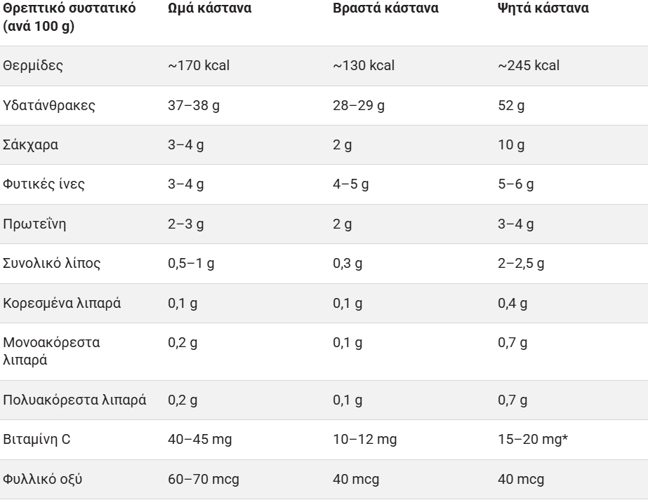 | Στοιχείο (ανά 100g) | Βραστά Κάστανα | Ψητά Κάστανα | Σημειώσεις |