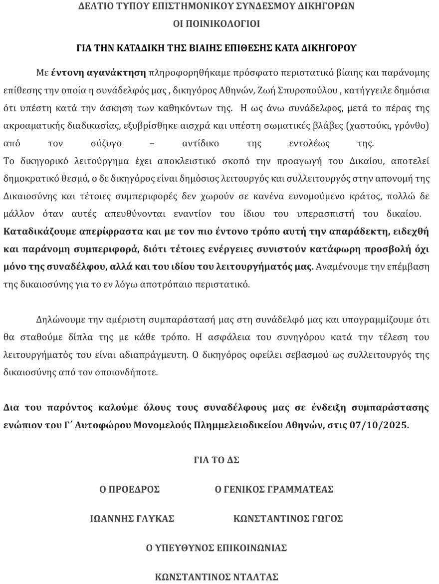 Ο «Επιστημονικός Σύνδεσμος Δικηγόρων – Οι Ποινικολόγοι» εξέδωσε ανακοίνωση με την οποία καταδίκασε το περιστατικό.