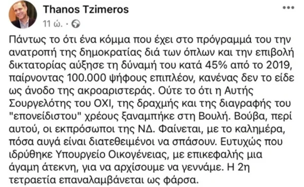 Η κυρία Ζαχαράκη βρέθηκε από νωρίς το πρωί στο υπουργείο και μεταξύ άλλων σχολίασε και τη σεξιστική επίθεση που δέχτηκε με το «καλημέρα» από τον Θάνο Τζήμερο. Ο οποίος ανέφερε στον λογαριασμό του στο facebook πως «ευτυχώς που ιδρύθηκε υπουργείο Οικογένειας, με επικεφαλής μια άγαμη και άτεκνη, για να αρχίσουμε να γεννάμε».